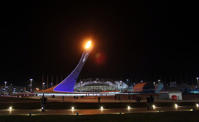 Vancouver 2010 Olympic flame Sochi 2014 (Fisht Olympic Stadium, Sochi, Russia): The cauldron, situated directly outside Fisht Olympic Stadium, was a large leaning tower.
