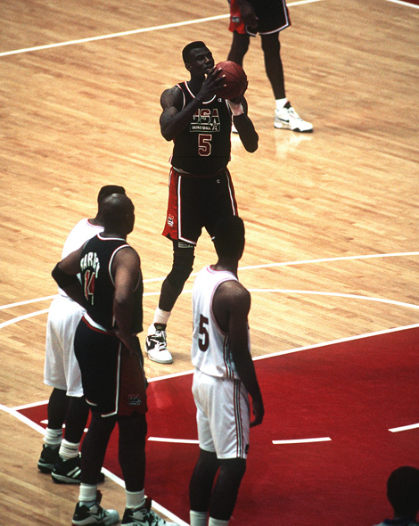 Images > other > At the 25th Olympic games Lt. David Robinson, US Navy Reserves, San Antonio, Texas, makes a field goal during the game between the "Dream Team" and Puerto Rico. Robinson scored 14 points. Photo by Ken Hackman, U.S. Air Force. This image is a work of a U.S. Army soldier or employee, taken or made during the course of the person's official duties. As a work of the U.S. federal government, the image is in the public domain.