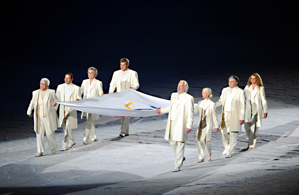 Olympic Flag Bearers Vancouver: Left to right, Betty Fox, mother of the late cancer activist Terry Fox; Jacques Villeneuve, the only Canadian race car driver to win the Indianpolis 500 and Formula 1 world championship; four-time Grammy Award winning singer Anne Murray; National Hockey League legendary defenseman Bobby Orr; actor Donald Sutherland, winner of Golden Globe and Emmy awards for HBO's "Path to War" and a Golden Globe for "Citizen X;" Barbara Ann Scott-King, a 1948 Olympic gold medalist in figure skating; Meritorious Service Cross recipient Romeo Dallaire, a Lieutenant General turned Senator who led the United Nations Observer Mission of 1993 in Uganda and Rwanda; and Canadian astronaut Julie Payette, who has logged more than 25 days in space, carry the Olympic Flag into BC Place stadium during the Opening Ceremony of the XXI Olympic Winter Games on Feb. 12 in Vancouver, British Columbia, Canada.Photo by Tim Hipps, FMWRC Public Affairs. This image is a work of a U.S. Army soldier or employee, taken or made during the course of the person's official duties. As a work of the U.S. federal government, the image is in the public domain.